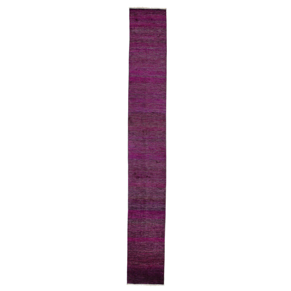 Characterized by simple yet sophisticated geometric patterns, this Pink Modern Viscose Wool Runner Rug 2'6" x 19'10" is inspired by Gabbah Persian rugs of history's past and is perfect for the modern home. This modern runner rug has been crafted by hand from durable wool with a variety of intricate stripes in bright purple and pink colors and finished with textured fringe. This one-of-a-kind modern runner rug offers a mesmerizing visual impact in your bedroom, hallway, or entryway.