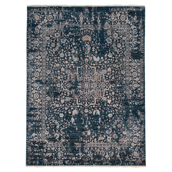 This Blue Modern Wool Blend Rug - 8'2" x 10'3" is expertly hand-knotted in India from durable wool for a long-lasting piece of one-of-a-kind character for your modern home. This traditional modern rug is the epitome of elegance with a lightly distressed traditional medallion design overlayed on a striated blue backdrop. This 8x10 medallion rug is a captivating centerpiece that will elevate your bedroom, living room, or dining room with its romantic charm and luxurious feel.
