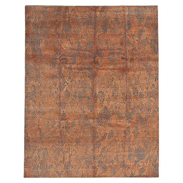 This contemporary area rug features an abstract pattern and a modern color palette. Measuring 9'1" wide by 11'8" long, this large rug is suitable for defining zones in living rooms, dining rooms, or spacious bedrooms. The rug is hand-knotted in India, combining the resilience of wool with the soft sheen of viscose. This material blend contributes to both the rug's durability and its texture. The design displays a complex pattern, which suggests a refined animal print or an abstract natural...