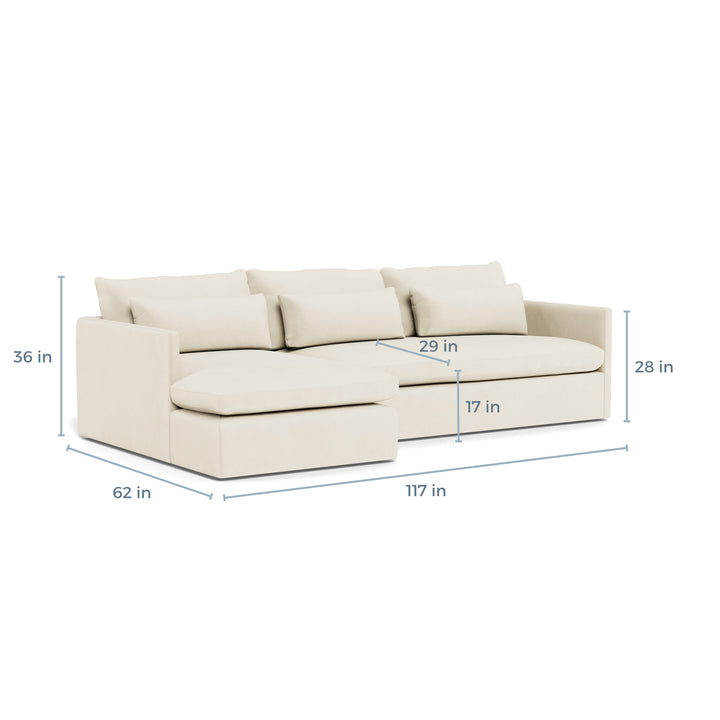 - Dimensions 117" W x 42"/66" D x 36" H | Arm/Back Height: 28" H | Seat Height: 17" H | Seat Depth: 29" D