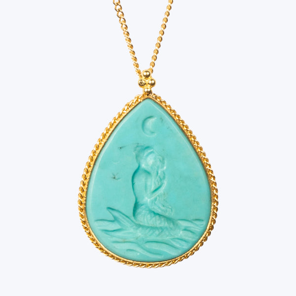 A mermaid etching in a bright turquoise stone is paired with a delicate gold chain to make the Medium Turquoise 18k One-of-a-Kind Necklace a special statement piece. Perfect for day or night, it's a necklace to love for years to come.