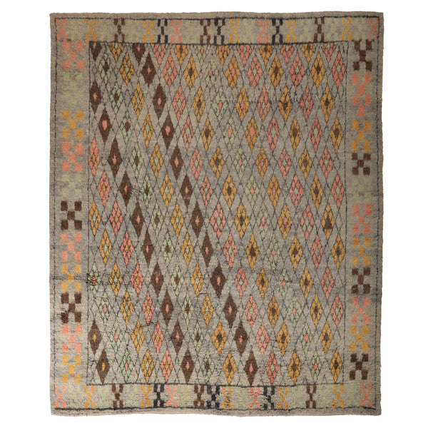 Hand-knotted of sumptuous wool with a traditional diamond design with an intricate geometric border inspired by centuries-old tribal motifs, this Vintage Moroccan Rug - 14'11" x 13'2" features a modern color palette in shades of pink, yellow, brown, and grey. This oversized Moroccan rug will bring intriguing texture, as well as, a dash of irresistible design to your living room, bedroom, or beyond!
