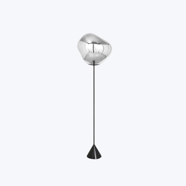 Melt is evocative of molten glass, the interior of a melting glacier or images of deep space. An imperfect, organic and naturalistic light that produces a mesmerizing hot-blown glass effect. Melt is created through a process of blow moulding and vacuum metallisation to achieve melted orbs with abundant and unusual luminosity. Here the orb elegantly rests on a slim base.