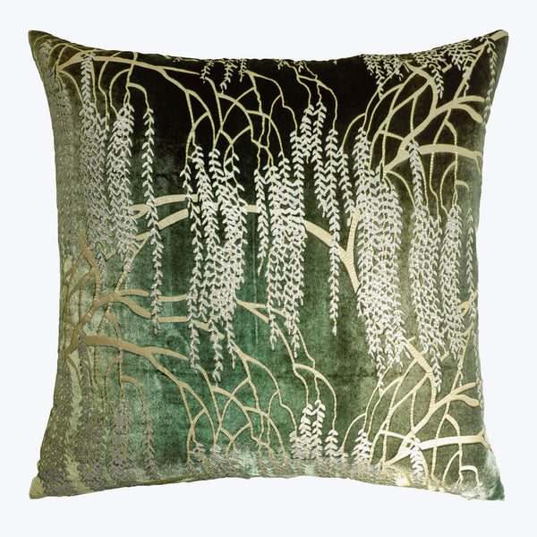 The Willow Metallic Velvet Pillow features a whimsical and elegant foliage pattern that adds an elegant touch to any room. Our metallic pigment prints add a new dimension to lustrous velvet. This design began in Kevin's sketchbook, was printed on silk velvet, then hand-painted in small batches by artisans in Philadelphia. Variations in color are part of the nature of our unique dying process that is applied by hand in layers on the soft velvet surface. Includes (1) silk velvet...