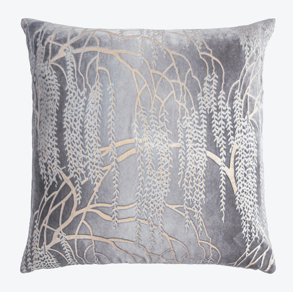 A whimsical willow tree pattern in metallic pigments adorns this silk velvet throw pillow.The velvet throw pillow, with its lustrous sheen and design, offers dimension to the home through elegant color, tone, and texture. This design began in Kevin’s sketchbook, was printed on silk velvet, then hand-painted in small batches by artisans in Philadelphia. Dye is applied by hand in layers on the velvet fiber surface. Variations in color are part of the nature of their unique dying process.