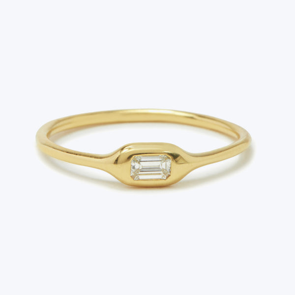 This sculptural and modern Mini Baguette Ring is sweet on its own or stunning mixed in with a stack of rings. This mini baguette-shaped diamond ring is hand-crafted from 18k polished gold with a 0.1 ct diamond.