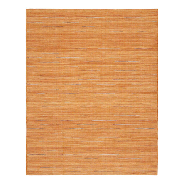This Orange Kavya Flatweave Kilim Rug offers a durable and functional foundation for various interior spaces. The rug measures 5'3" x 7'3" and features a solid orange color, providing a warm focal point. Constructed from a blend of 90% wool and 10% cotton, this flatweave kilim rug is handwoven in India. The wool content contributes to natural durability, softness underfoot, and resistance to wear. The cotton fibers provide a stable and strong foundation. This flatweave construction results in a low-profile...