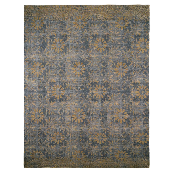 This 9' X 12' Contemporary Rug is a handknotted piece crafted from 100% silk, originating from India. It features a primary blue color palette, offering both visual depth and a luxurious tactile experience. The rug's design showcases a distressed, faded aesthetic, providing a blend of modern style and vintage appeal. A repeating floral or medallion-like pattern, rendered in contrasting golden-yellow tones, is set against the muted blue-grey foundation. This motif is distributed in a grid-like arrangement across the field, with...