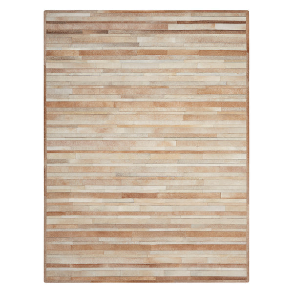 This Modern Handwoven Hide Rug - 5'6" x 7'5" brings rustic beauty into your home with neutral beige hues from the natural cowhide tones in a sophisticated geometric stripe design. This all-natural animal skin rug is one-of-a-kind due to the nature of the material; therefore, some colors may vary.
