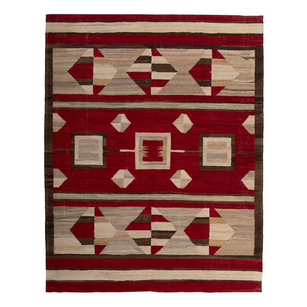 This contemporary wool kilim features a distinct red and multi-color geometric pattern, measuring 7 feet 11 inches by 9 feet 6 inches. It is crafted from durable wool fibers using the traditional flatweave technique. The design incorporates a series of horizontal bands. The dominant central band features a rich red field accented with cream, beige, and grey geometric shapes, including squares and diamonds. A notable central motif comprises a stepped square design. Above and below this central section, broader bands...