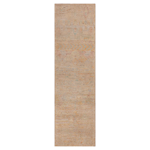 Enhance your living space with the Beige Modern Wool Runner - 2'9" x 9'8". Hand-knotted in India, this contemporary rug features a subtle distressed texture with a faded pastel color palette. The gentle geometric pattern adds a touch of style, perfect for hallways or any space in need of a high-quality, elegant touch.