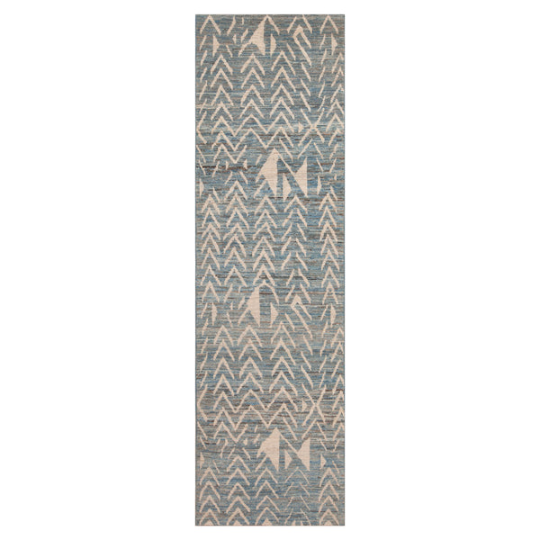 This Blue Zameen runner measures 3 feet by 10 feet 8 inches. Hand-knotted in India from pure wool, it offers durability and a soft feel underfoot. The design features a contemporary abstract pattern. Interlocking off-white chevron motifs create a dynamic texture against a multi-tonal blue background. Larger, scattered triangular shapes introduce visual breaks within the overall pattern. The varied blue tones contribute depth to the runner's appearance. As a hand-knotted item, each piece possesses subtle variations, highlighting its artisanal quality....