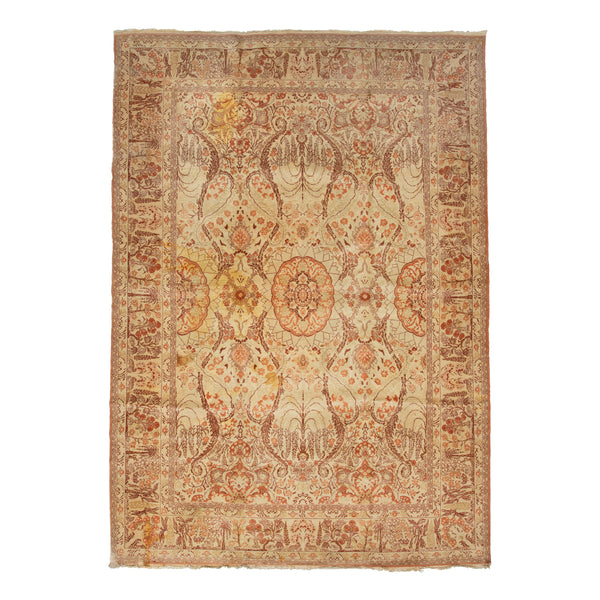 A 10' x 14'6" hand-knotted wool rug is not just an accessory; it’s an event. Originating from India, this rug is a testament to the enduring craft of traditional weaving, a practice that transforms fibers into storytelling. The gold-toned background, threaded delicately with lighter cream hues, brings depth and warmth, an elegant whisper amid the silence. Patterns of rich terracotta, muted red, and earthy brown dance across its surface in intricate floral and vine motifs, leading the eye to a...