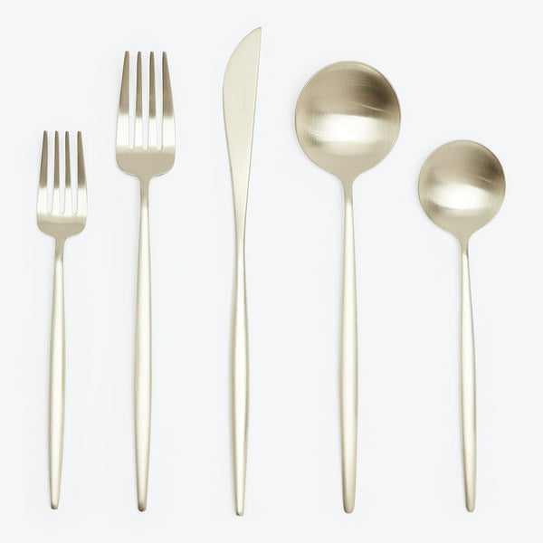 Beautifully rendered in a champagne gold-plated matte finish, the Moon 5-Piece Flatware Set from Cutipol features slender, elongated handles — ergonomically designed for balance and control. Knife blades are crafted from 420 steel, providing strong cutting power and resistance to oxidation. This set breathes a spirit of innovation into an inspired and creative table.