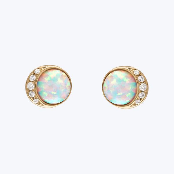 An Eden Presley favorite, the large Moonrise Studs stun with celestial beauty. These exquisite earrings are handcrafted in 14K yellow gold and feature a beautiful color-shifting opal complemented by diamonds. Style them alongside Presley’s Starbust Stud Earrings. Sold as a pair. Made in the USA.