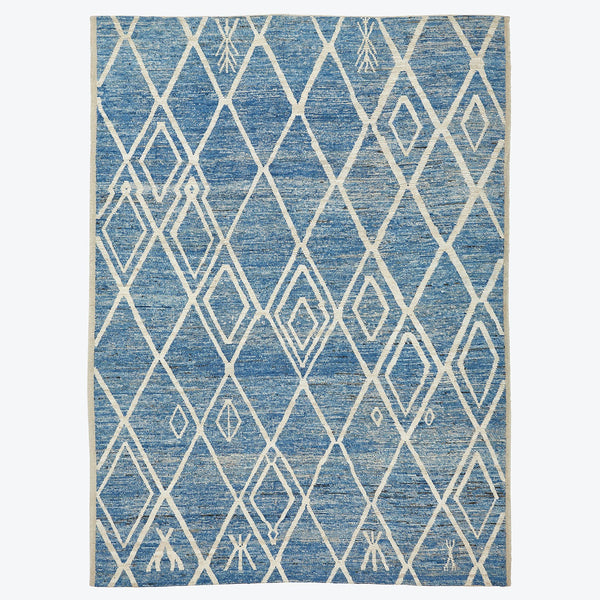 The blue Moroccan-style rug commands attention, not just for its imposing size—10'2" by 13'9"—but for its profound presence. Crafted with precision in Turkey, it's a labor of love and tradition, echoing the soft whispers of skilled hands laboring over natural, hand-carded wool. This rug isn't merely a floor covering; it’s a narrative of craftsmanship, each fiber a testament to resilience and beauty, ready to absorb the footfalls of daily life without losing its luster. Its foundation is a deep, serene...