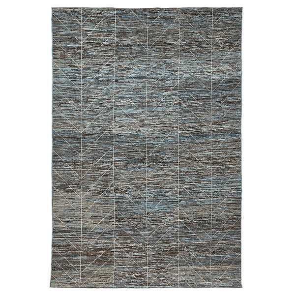 Elegance lies in the harmony of the unexpected, and this Moroccan wool rug exemplifies just that. Crafted in Turkey, its generous dimensions—10'4" by 14'9"—provide a bold foundation for any expansive room. The allure is in the details. Natural, hand-carded wool whispers stories of its origins through a grey canvas that shifts subtly with the light, revealing ghostly hints of blues and earthy browns. These chromatic shifts offer a gentle complexity to the overall hue, allowing the rug to seamlessly engage...