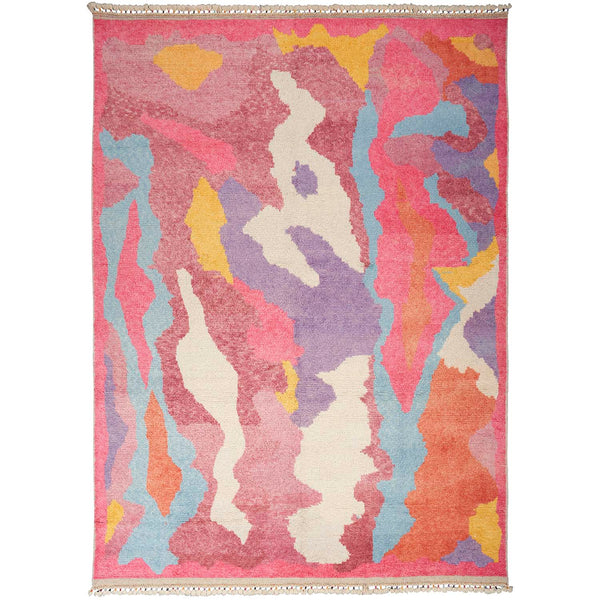 Whimsical in its re-interpretation, this Moroccan-style rug masterfully reduces a medley of vintage textile influences to its most essential form, translating the worlds of the embroidered Afghan suzani, the psychedelic Ikat, and the bold geometry of Moroccan motifs into a playful canvas of vibrant color. Handmade in Turkey from wool.