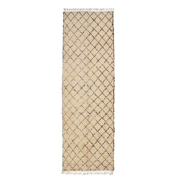Enhance your space with the Natural Moroccan Wool Runner. This hand-knotted 5' x 7'9" rug features a simple geometric pattern in off-white with dark diamond designs. Inspired by Moroccan styles, this high-quality wool rug adds a touch of elegance and texture to any room.
