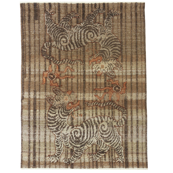 Hand-knotted in India from durable wool, this Brown Double Tiger Moroccan Wool Rug - 4'6" x 6'4" is true to legendary designs of Tibetan myths with its legendary double tiger design. Created to invoke fearlessness and perseverance, this area rug is an inspiring foundation for your bedroom, living room, or dining room. Timeless and tribal, yet still contemporary and stylish.