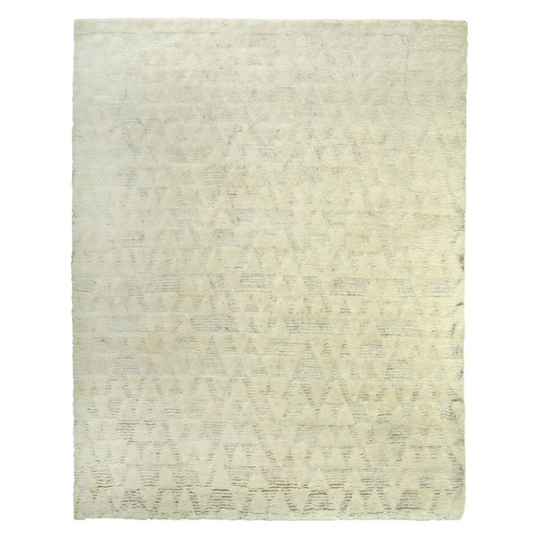 This Ivory Geometric Textured Moroccan style Rug 8' x 10' is hand-knotted from Mongolian wool by expert Indian artisans. This plush rug features a high-low triangle geometric pattern in shifting shades of ivory and grey. For centuries, Moroccan and Mongolian wool rugs have served as a durable foundation material for exceptional insulation for warmth in the winter and cooling in the summer. The strong fibers can withstand daily for many decades.
