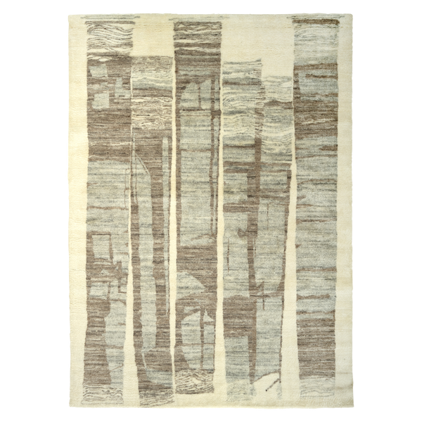 This Ivory and Tan Abstract Moroccan Wool Rug 9' x 12' is hand-knotted from Mongolian wool by expert artisans helping preserve the cultural traditions of Moroccan rug making. This traditional plush rug is made anew with an immersive modern abstract design in rich warm tones of ivory, tan brown, and blue. For centuries, natural Mongolian wool rugs have served as a durable foundation material for exceptional insulation for warmth in the winter and cooling in the summer. The strong fibers...