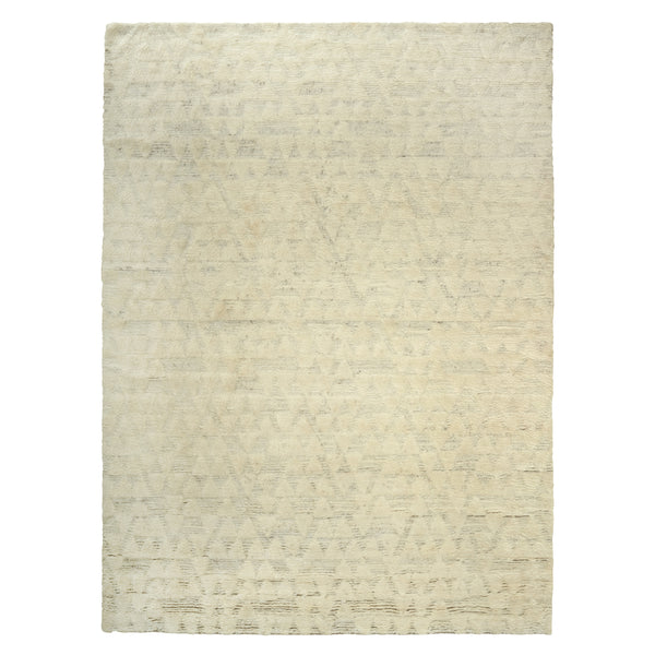 This Ivory Geometric Textured Moroccan Wool Rug 9' x 12' is hand-knotted from Mongolian wool by expert artisans helping preserve the cultural traditions of Moroccan rug making. This plush rug features a high-low triangle geometric pattern in shifting shades of ivory and grey. For centuries, Mongolian wool rugs have served as a durable foundation material for exceptional insulation for warmth in the winter and cooling in the summer. The strong fibers can withstand daily use in your most frequented spaces....
