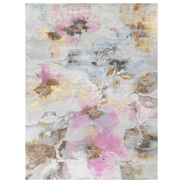 The Multicolored Contemporary Silk Wool Rug - 9' x 12' features an abstract design with shades of pink, blue, grey, and brown creating a watercolor effect. Hand Knotted in India, this high-quality silk wool blend rug adds a modern aesthetic to any interior space with its unique pattern and luxurious texture.