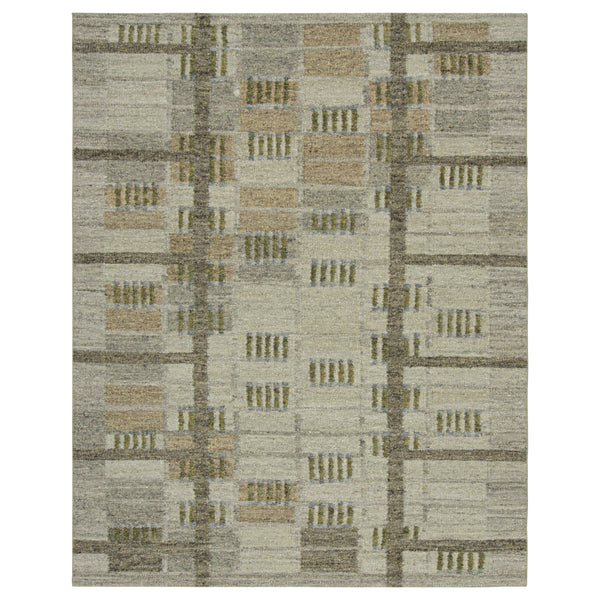 The Multicolored Swedish Inspired Flatweave Wool Contemporary Rug, measuring 7'9" x 10'1", features a sophisticated design with neutral shades of beige, gray, and muted greens. Hand woven in India, this high-quality rug showcases a modern grid-like pattern with a geometric feel. The wool material adds texture and durability, making it a versatile and stylish addition to any home decor.