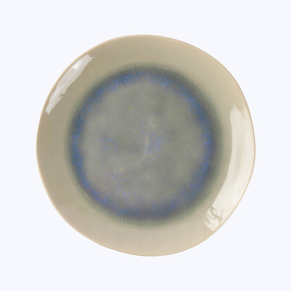 Introducing the Mystic Dinner Plate, Opal. This round ceramic plate features a wide, slightly irregular rim with a natural, earthy finish. The center showcases soft blue hues, and the dynamic, fractal-like pattern adds to its allure. Handcrafted with a beautiful variation, this artisan piece measures 10" and is made of lead + cadmium-free ceramic.