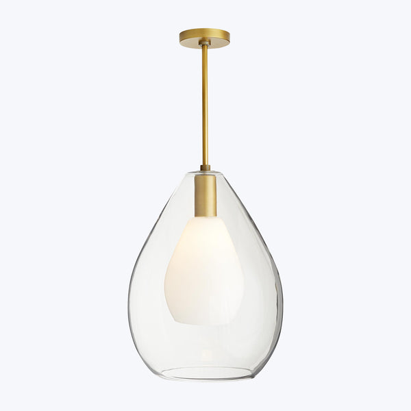 Adorn your home with the quiet elegance of the Nala Pendant. Conceptualized by Arteriors, this deceptively simple pendant features handblown teardrop-shaped glass in a nested design. The inner teardrop conceals a standard bulb in opal glass. The Nala Pendant is suspended in a stainless steel stem finished in antique brass.