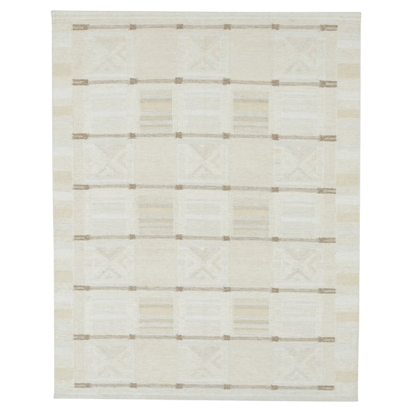 This 8' x 10' Kilim rug features a Swedish-inspired design, offering a clean and minimalist aesthetic for various interior spaces. The rug's natural color palette and subtle geometric patterns provide a versatile foundation for modern, contemporary, or transitional decor. Crafted from an Art Silk and Wool blend, this rug combines the softness and durability of wool with the subtle luster of art silk. It is a hand-woven flatweave kilim, a traditional construction method that results in a durable, low-profile rug...