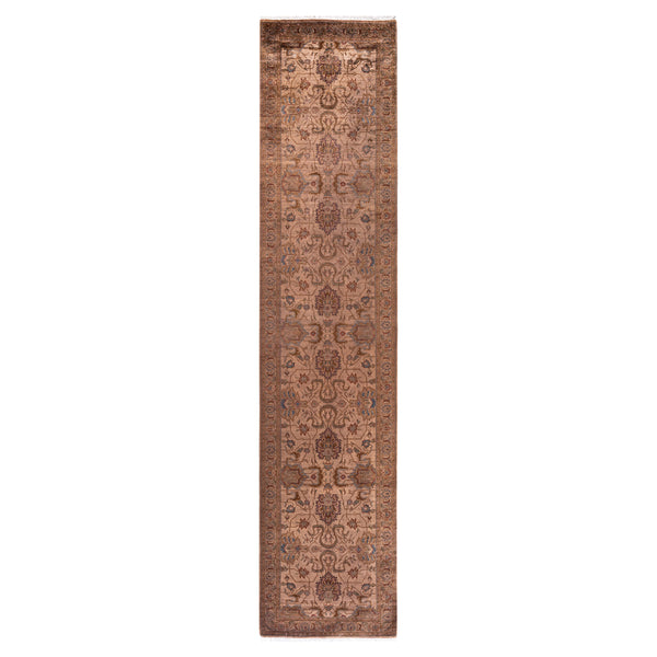 This Tan and Pink Overdyed Transitional Wool Runner - 2'7" x 12'4" epitomizes classic rug designs with a twist: a traditional pattern is overdyed in a brilliant mix of soft pink and tan tones. This hand-knotted runner rug is washed in a 100% natural botanical dye that reveals hidden nuances in the unique designs. This one-of-a-kind overdyed runner transcends trends, and its sturdy construction ensures that it’ll withstand years of heavy traffic. This neutral runner is finished with a traditional...