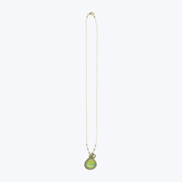 Discover the Caged Peridot Quartz Necklace by Danielle Welmond. Featuring a stunning peridot quartz framed by seed pearls and woven gold cord, this refined bohemian necklace plays with rich, earthy color. A gorgeous olive pearl drop adds a whimsical finish. Handcrafted in Los Angeles. Measures 17”.