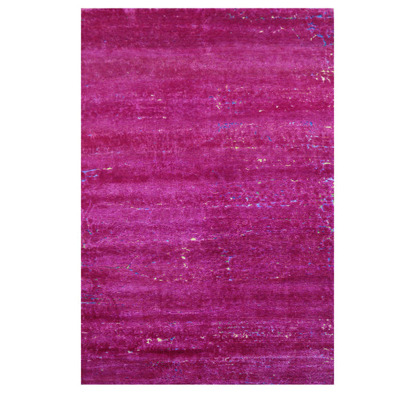 The Pink Nu Vibrant Silk Tibetan Rug is a distinct 6' x 9' area rug designed for contemporary interior spaces. This floor covering is crafted from 100% silk, offering a soft texture and a noticeable sheen. Hand-knotted in Nepal, this Nu Vibrant rug features a rich pink color, akin to fuchsia or magenta, intended to provide a bold visual anchor. The rug's surface displays subtle horizontal striations and tonal variations, contributing to its modern and abstract aesthetic. This meticulous construction...