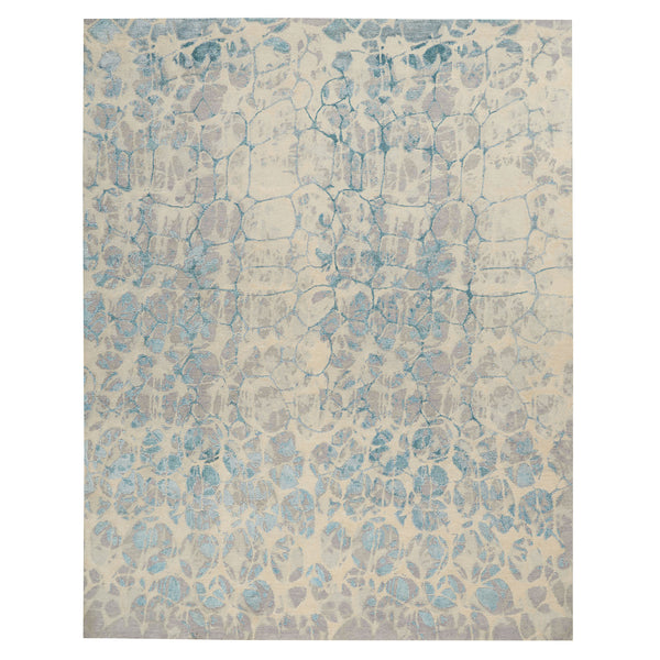 This Blue Modern Abstract Rug, Birch, measures 9' x 12' and offers a versatile transitional style. The design features an abstract pattern with organic, fractured elements in varying shades of blue and muted grey, set against a light birch-toned background. This combination allows the rug to integrate into both contemporary and classic interior settings. Crafted in India, this rug is hand-knotted, a traditional method known for its durability and intricate detail. The construction involves a blend of wool, silk, and...