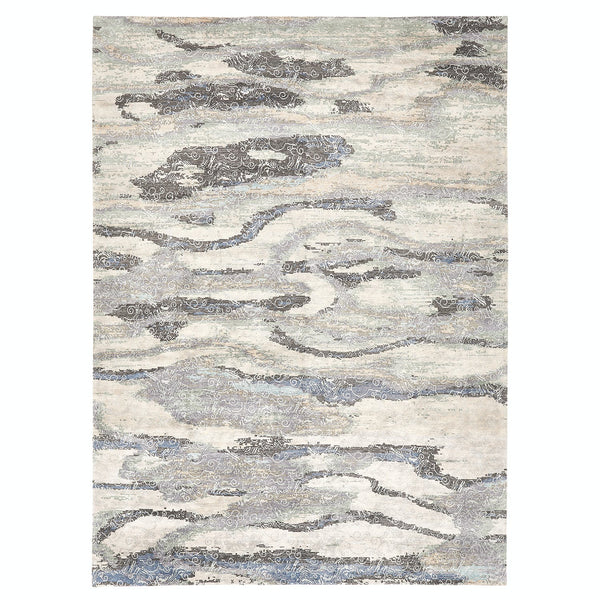 This isn't just a rug; it's a canvas on which artisans tell a story of modern design intertwined with age-old craftsmanship. Measuring an imposing 10 by 14 feet, this hand-knotted marvel from Nepal invites attention with its abstract dance of greys, off-whites, and whispers of muted blue. The intricate design draws you in, hinting at the "Nu Vibrant" flair that brings a fresh energy to the calm neutrality of its palette. Crafted from premium Tibetan wool, each fiber speaks of...