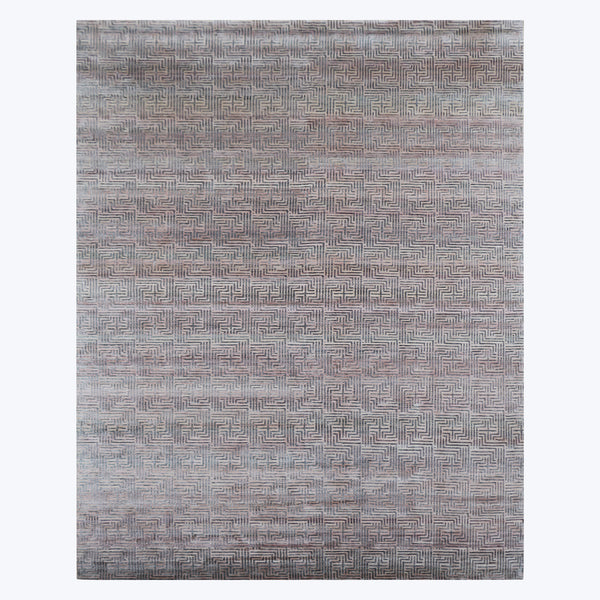 This 12' x 15' Nu VibrantTibetan Contemporary Rug combines modern design with traditional craftsmanship. Hand-knotted in Nepal, this rug is constructed from silk, offering a refined texture and a subtle sheen. The rug features a repeating geometric pattern, appearing as an intricate, maze-like motif across its surface. The color palette blends shades of grey and pink, creating a nuanced and adaptable visual effect. As a large-format rug, it is suitable for various contemporary interior settings, including spacious living rooms, dining...