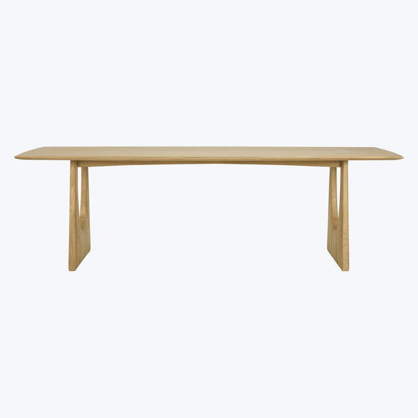 With enriched shapes and unexpected details, the Geometric solid oak dining table is a statement item, equally at home in the dining room or workspace. Luxury comes with its length, which is offset by softened edges and natural lines. Interesting shapes are in play to add volume and practical comfort. Made from solid oak with a hard wax oil finish.