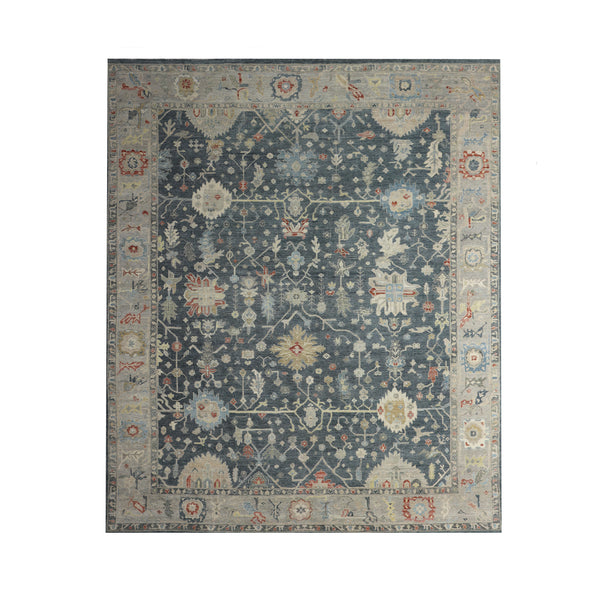 This Blue Traditional Wool Rug features a symmetrical pattern inspired by Persian and Oriental carpets. With intricate floral and geometric motifs in muted shades of blues, reds, oranges, and beiges, this hand-knotted rug from India exudes sophistication and craftsmanship. Perfect for a refined setting or as a collector's piece.