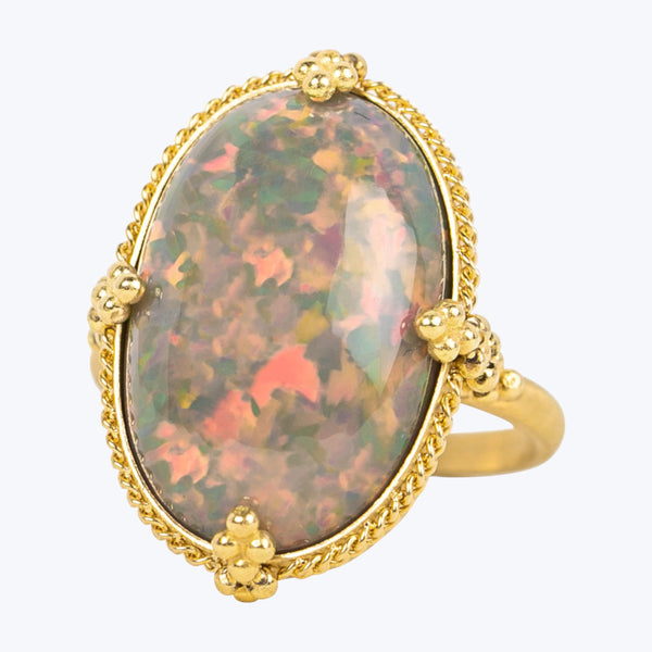 Discover the One of a Kind Ethiopian Opal Ring by Amáli. Featuring a stunning opal cradled in textured 18K gold, this beautiful ring is infused with a romantic, old-world vibe. A showstopping piece, perfect for anyone with a penchant for vintage or handcrafted artistry. Made in the USA.