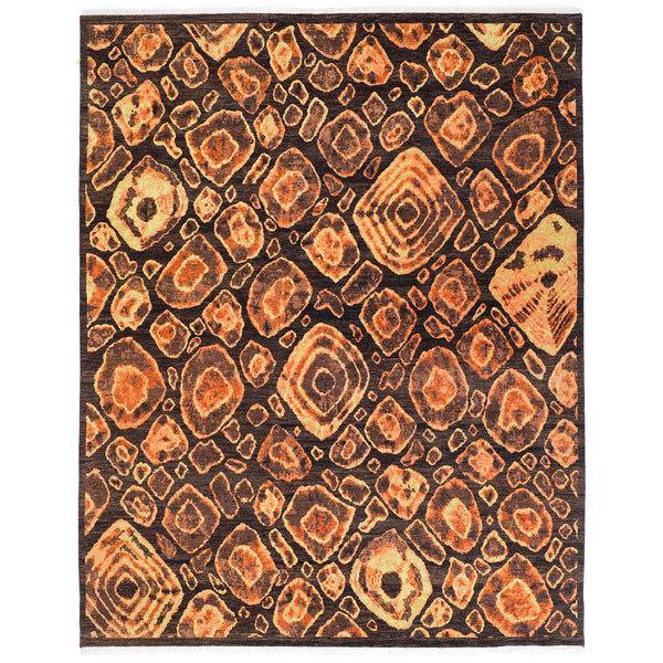 The rug exudes an aura that commands attention. With its hand-knotted wool and cotton blend, this piece from India doesn’t just lie on the floor; it becomes an intricate dance of texture and form. Its abstract design—a tableau of warm oranges, light browns, and creamy hues against a deep brown canvas—evokes nature’s artistry, reminiscent of weathered rock formations. Measuring a substantial 8'2" by 9'11", it’s more than just décor; it’s a space-defining statement. Each organic shape tells a story, leading...