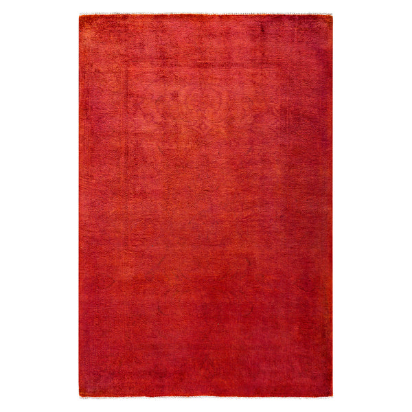 This hand-knotted wool rug from Pakistan features an overdyed orange finish, measuring 4 feet 1 inch by 6 feet 4 inches. The overdyed technique saturates the rug in a deep, uniform orange, allowing subtle hints of underlying traditional patterns and textures to show through. This process creates a distinctive appearance, blending vintage appeal with a contemporary color application. Crafted from natural wool fibers, this rug offers durability and a soft feel underfoot. Wool is known for its resilience to daily...