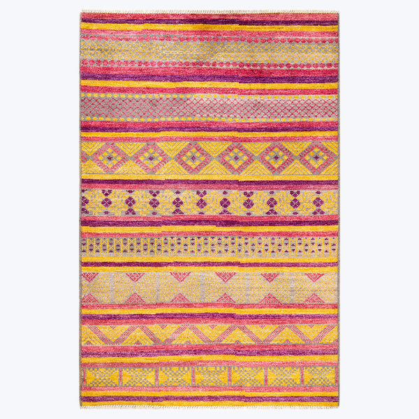 This Multicolored Traditional Wool Rug - 5' 7” x 8' 1" adds color to any space. Its unique design features geometric shapes in pink, yellow, purple, and green. Hand knotted from wool, this rug's intricate patterns and bold colors give it a worldly aesthetic.