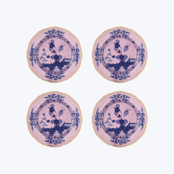 The Oriente Italiano Coasters, Set of 4 by Ginori 1735 marries Italian opulence with ancient Asian motifs. Crafted in fine porcelain, this beautiful set of four coasters boasts a stunning ornate pattern accentuated by hand-painted gold trim. An exquisite addition to any table. Made in Italy. Available in shades of Aurum, Azalea, and Iris.