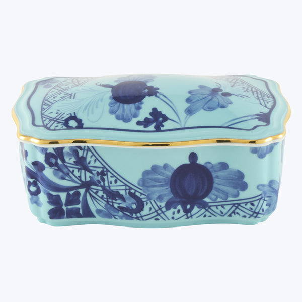 The Oriente Italiano Small Trinket Box by Ginori 1735 is a luxurious decorative piece from the renowned Italian tableware maker. Crafted in fine porcelain, this exquisite trinket box is hand-painted with a delicate gold edge. Perfect for storing rings and other fine jewelry. Available in shades of Aurum, Azalea, and Iris.