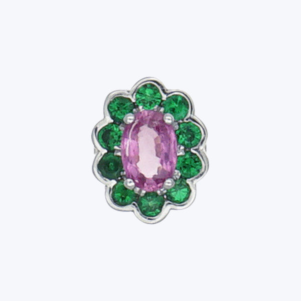 The Pink & Green Oval Flower Charm features a vibrant pink sapphire with green tsavorites surrounding the center stone.