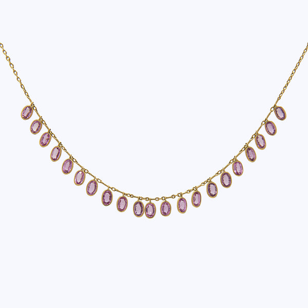 This Pink Sapphire Oval Fringe NecklaceĀ speaks to Kothari's passion for antique jewelry retold in a modern, minimalist approach. Handcrafted in California with a reverence for nature + its tiniest wonders, each stone is custom-cut or hand selected and set in 18k gold.