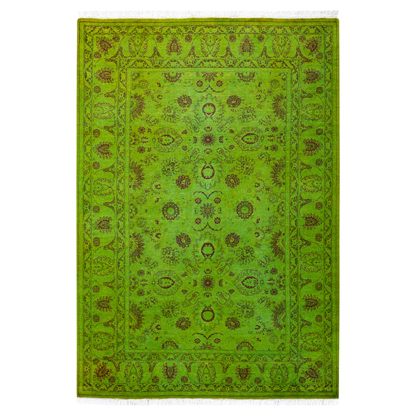 This Green Overdyed Wool Rug - 4'3" x 6' epitomizes classic with a twist: a traditional pattern overdyed in a brilliant neon green color. This hand-knotted rug is washed in a 100% natural botanical dye that reveals hidden nuances in the unique designs. This one-of-a-kind overdyed rug transcends trends, and its sturdy construction ensures that it’ll withstand years of heavy traffic. Finished with a traditional fringe.