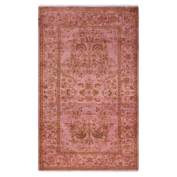 This Pink Overdyed Wool Rug - 3'1" x 5'1" epitomizes classic with a twist: a traditional pattern overdyed in a soft rose pink color. This hand-knotted rug is washed in a 100% natural botanical dye that reveals hidden nuances in the unique designs. This one-of-a-kind overdyed rug transcends trends, and its sturdy construction ensures that it’ll withstand years of heavy traffic. Finished with a traditional fringe.